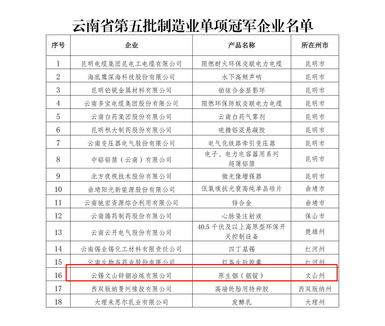 1月9日,云南省工業(yè)和信息化廳正式公布了“云南省第五批制造業(yè)單項(xiàng)冠軍企業(yè)名單”,文山鋅銦憑借在主導(dǎo)產(chǎn)品——原生銦(銦錠)領(lǐng)域的卓越貢獻(xiàn)與持續(xù)創(chuàng)新,榮獲“云南省第五批制造業(yè)單項(xiàng)冠軍企業(yè)”稱號。