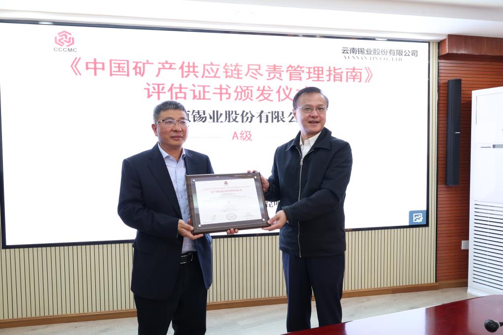 近日,中國五礦化工進出口商會會長江輝、發(fā)展部主任孫立會,及倫敦金屬交易所負責任工商經(jīng)理楊茗友一行到訪云錫,與云錫控股公司領(lǐng)導楊奕敏、錫業(yè)股份黨委書記、董事長、總經(jīng)理劉路坷開展座談,并向錫業(yè)股份頒發(fā)《中國礦業(yè)供應(yīng)鏈盡責管理指南》評估證書。