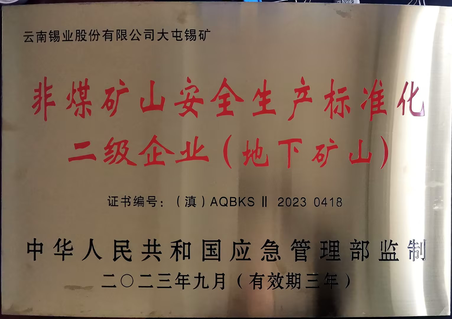 近日,錫業(yè)股份卡房分公司、大屯錫礦兩家單位收到由中華人民共和國應急管理局監(jiān)制、云南省應急管理廳頒發(fā)的牌匾和證書,正式確認為“非煤礦山安全生產(chǎn)標準化二級企業(yè)”,為今后持續(xù)穩(wěn)定發(fā)展打下良好基礎。
