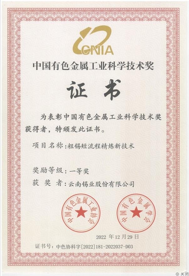 近日,中國有色金屬工業(yè)協(xié)會、中國有色金屬學(xué)會發(fā)布了榮獲2022年度中國有色金屬工業(yè)科學(xué)技術(shù)獎項目,由云錫控股公司牽頭負責(zé),錫業(yè)股份錫業(yè)分公司、昆明理工大學(xué)、綠地環(huán)保共同參與的“粗錫短流程精煉新技術(shù)項目”榮獲2022年度“中國有色金屬工業(yè)科學(xué)技術(shù)獎一等獎”。
