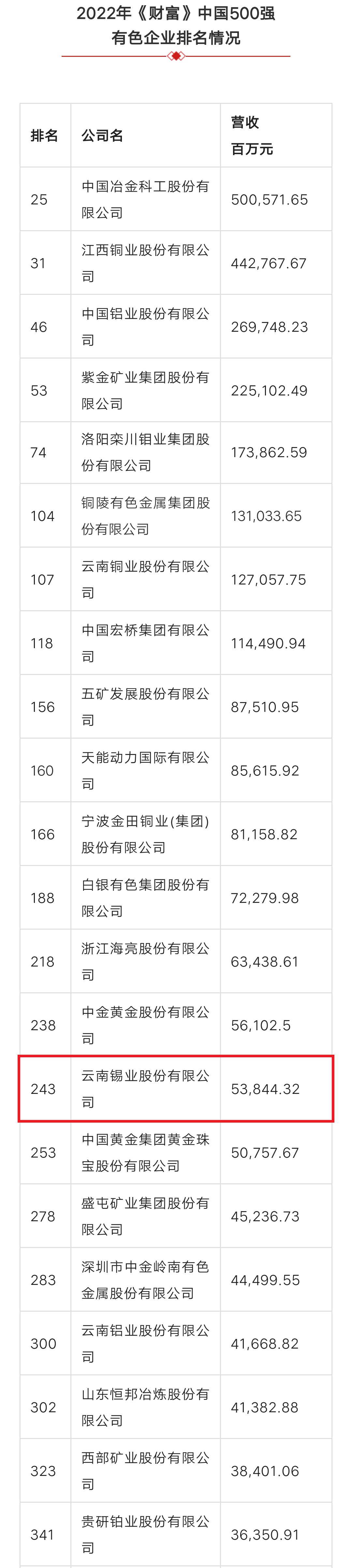 近日,2022年《財富》中國500強排行榜揭曉。今年500家上榜的中國上市公司總營業(yè)收入達到62萬億元人民幣,和上年上榜公司相比,增長約17.4%;凈利潤達到了4.7萬億元,較上年增長約9.2%。云南錫業(yè)股份有限公司以營收538.44億元的業(yè)績,排名第243位,發(fā)展實力和企業(yè)競爭力再獲認可。