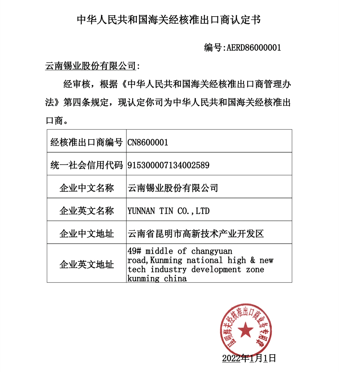 2022年1月1日,《區(qū)域全面經(jīng)濟(jì)伙伴關(guān)系協(xié)定》(RCEP)正式實(shí)施。當(dāng)天上午,云南錫業(yè)股份有限公司通過昆明海關(guān)審核認(rèn)定,成為RCEP實(shí)施后云南省首家,全國(guó)第十三家經(jīng)核準(zhǔn)出口商。