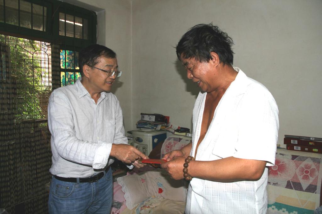 錫業(yè)股份黨委委員、工會(huì)主席李林走訪慰問(wèn)老廠分公司困難職工李生保。(劉亞杰/攝)