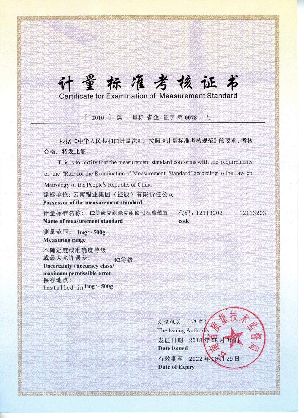 近日,云錫11項(xiàng)企業(yè)最高計(jì)量標(biāo)準(zhǔn)一次通過復(fù)查考核,獲得了由云南省質(zhì)量技術(shù)監(jiān)督局頒發(fā)的《計(jì)量標(biāo)準(zhǔn)考核證書》。