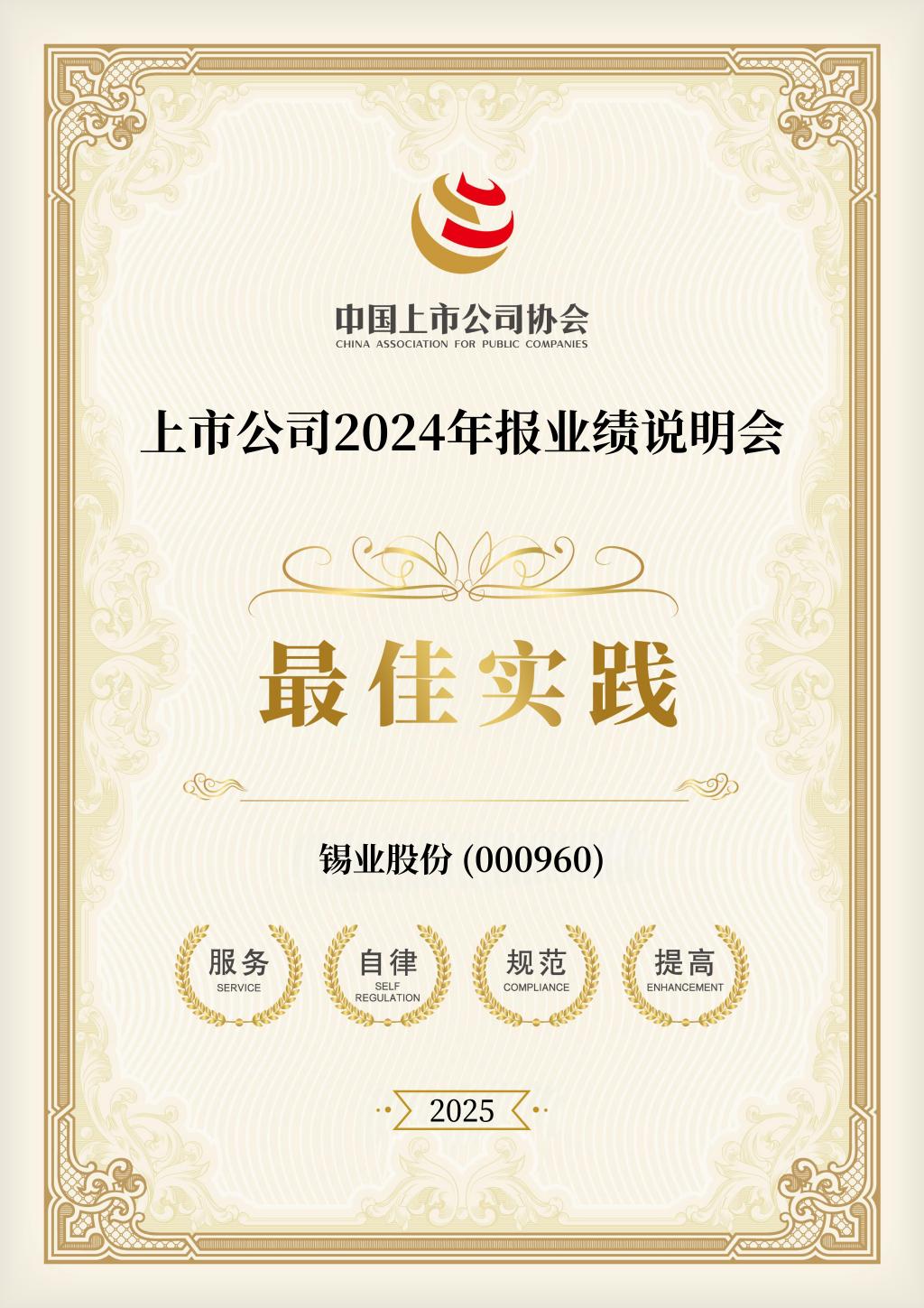 近日,中國(guó)上市公司協(xié)會(huì)(簡(jiǎn)稱(chēng)“中上協(xié)”)發(fā)布“2025上市公司董辦最佳實(shí)踐”及“2025年報(bào)業(yè)績(jī)說(shuō)明會(huì)最佳實(shí)踐”榜單,錫業(yè)股份憑借在信息披露管理事務(wù)、公司治理機(jī)制建設(shè)、投資者關(guān)系管理事務(wù)、相關(guān)制度的制定和修訂、監(jiān)督培訓(xùn)、業(yè)績(jī)說(shuō)明會(huì)交流形式及效果等方面的優(yōu)異表現(xiàn),首次入選“上市公司董辦最佳實(shí)踐”并蟬聯(lián)“年報(bào)業(yè)績(jī)說(shuō)明會(huì)最佳實(shí)踐”。