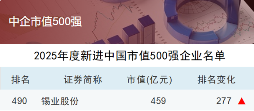 2026年1月1日,Wind 萬得發(fā)布2025年度中國上市企業(yè)市值500強(qiáng)榜單,錫業(yè)股份(證券代碼:000960)憑借459億元市值(較年初漲幅超過102%)位列榜單第490名,較上一年度大幅提升277位,標(biāo)志著公司作為全球錫行業(yè)龍頭的市場地位與投資價(jià)值獲資本市場高度認(rèn)可。