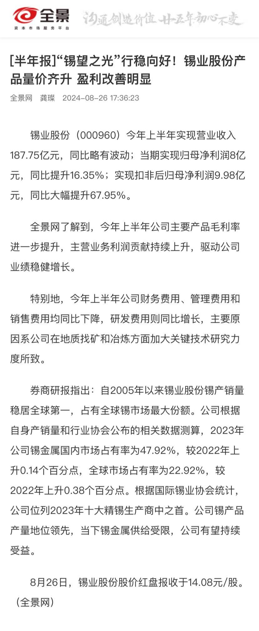 全景網(wǎng):[半年報(bào)]“錫望之光”行穩(wěn)向好!錫業(yè)股份產(chǎn)品量?jī)r(jià)齊升 盈利改善明顯