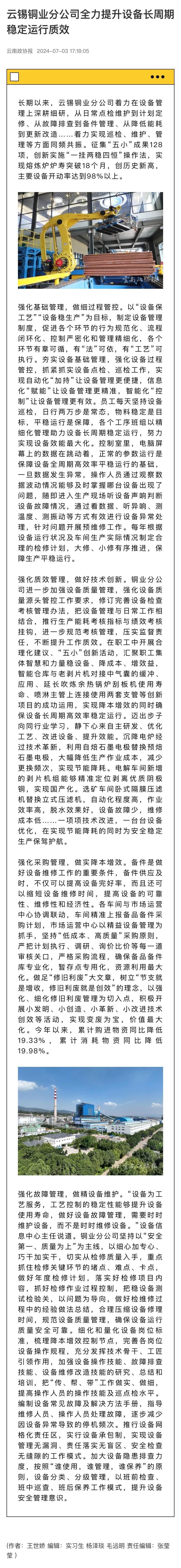 云南政協(xié)報、有色新聞:云錫銅業(yè)分公司全力提升設(shè)備長周期穩(wěn)定運行質(zhì)效