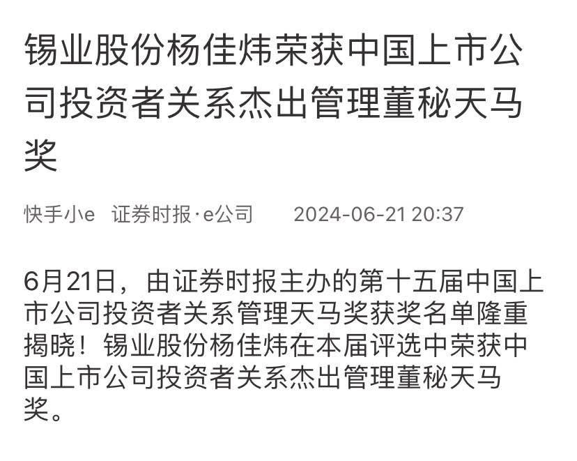 證券時報·e公司:錫業(yè)股份楊佳煒榮獲中國上市公司投資者關(guān)系杰出管理董秘天馬獎