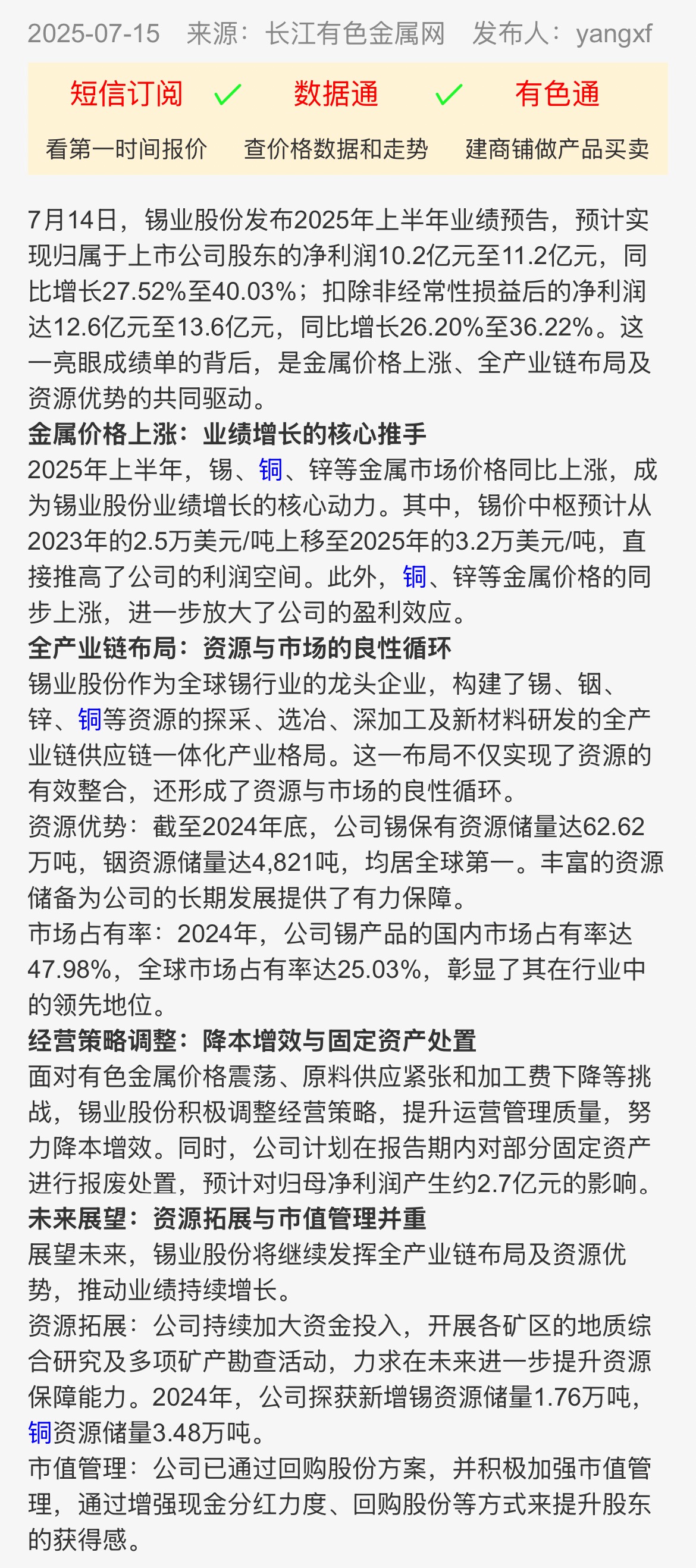 長(zhǎng)江有色金屬網(wǎng):半年凈利破10億!金屬價(jià)格飆升+全產(chǎn)業(yè)鏈優(yōu)勢(shì),錫業(yè)股份為何能領(lǐng)跑行業(yè)?