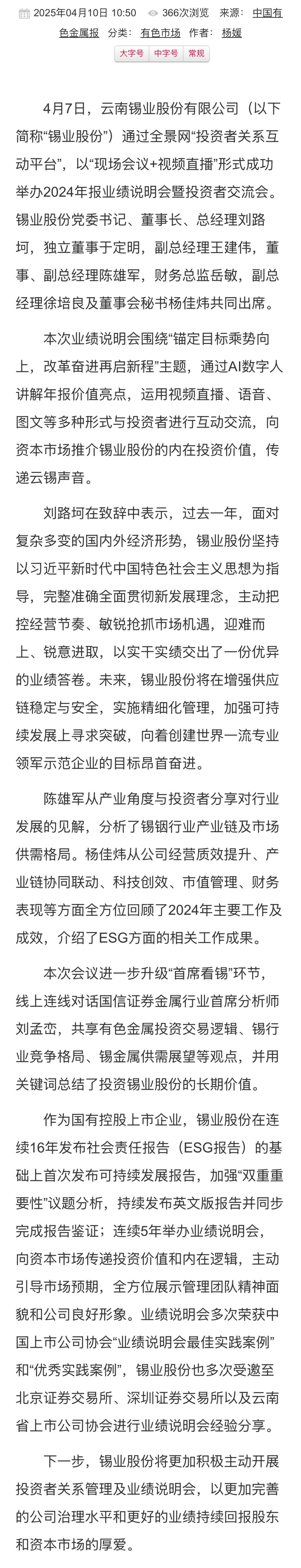 中國有色金屬報:錫業(yè)股份成功舉辦2024年報業(yè)績說明會