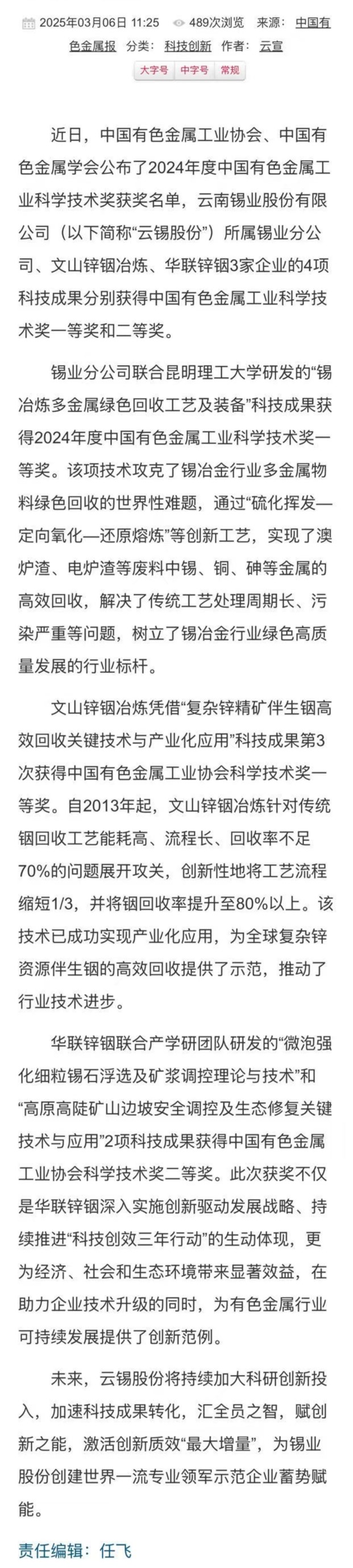 中國有色金屬報:云錫股份所屬企業(yè)4項科技成果獲2024年度中國有色金屬工業(yè)科學技術(shù)獎