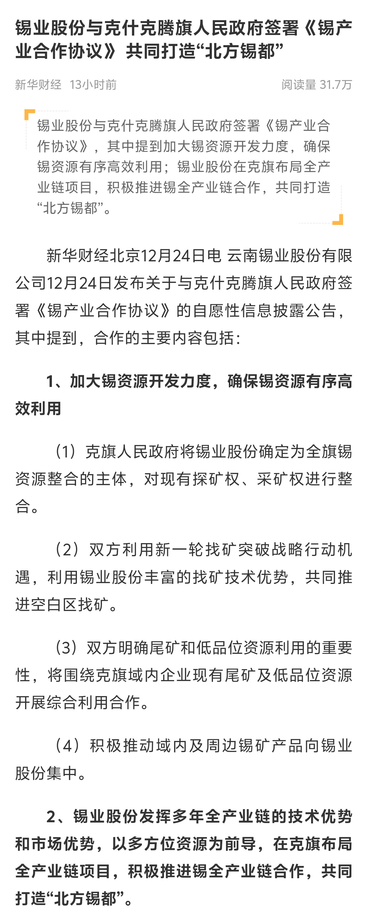 新華財(cái)經(jīng):錫業(yè)股份與克什克騰旗人民政府簽署《錫產(chǎn)業(yè)合作協(xié)議》 共同打造“北方錫都”