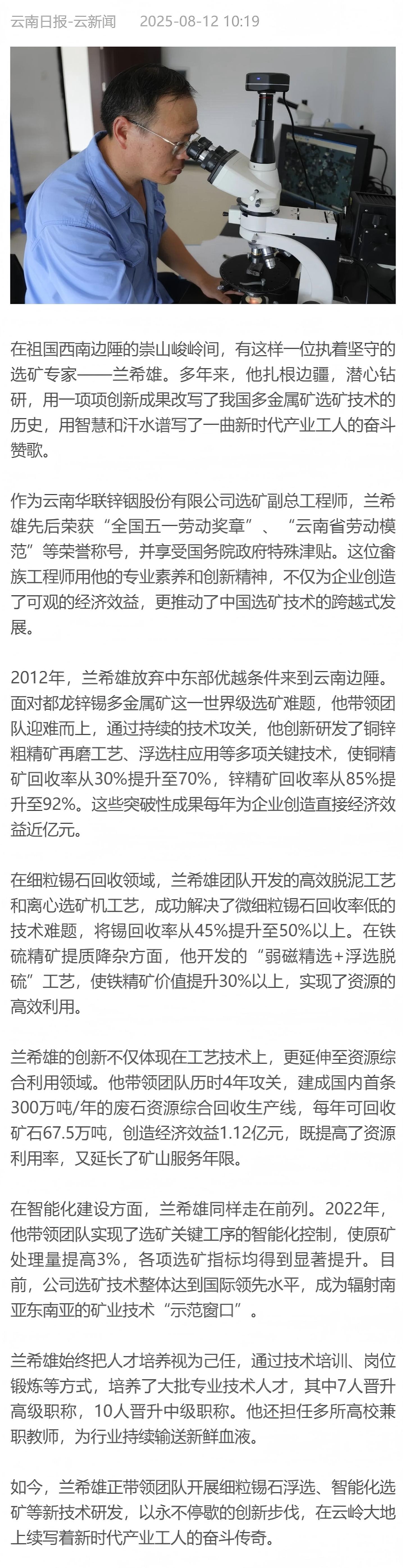 云南日?qǐng)?bào):全國(guó)勞動(dòng)模范蘭希雄——扎根邊疆的選礦專家