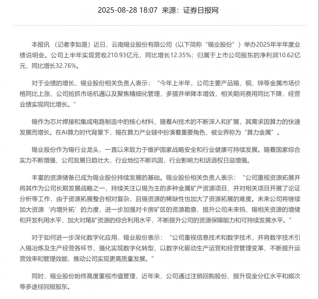 證券日?qǐng)?bào)網(wǎng):錫業(yè)股份2025半年度業(yè)績(jī)說(shuō)明會(huì)——提升資源保障能力 多途徑回報(bào)股東