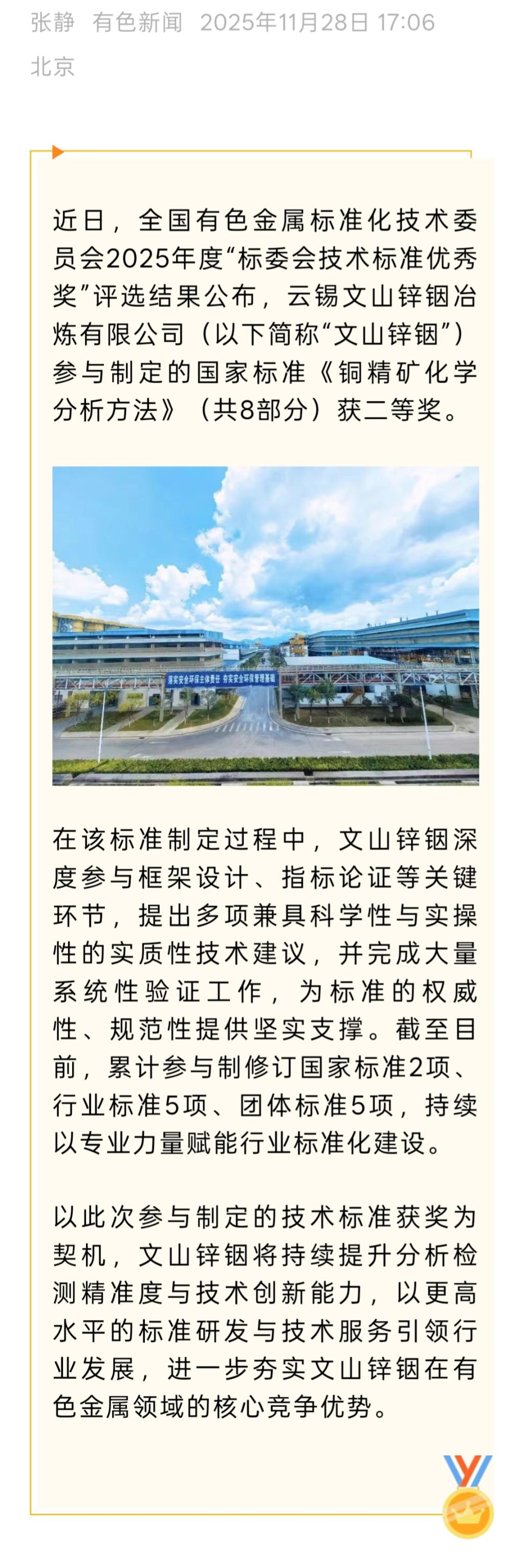 有色新聞:文山鋅銦參與制定的行業(yè)標(biāo)準(zhǔn)榮獲全國(guó)有色標(biāo)委會(huì)技術(shù)標(biāo)準(zhǔn)優(yōu)秀獎(jiǎng)