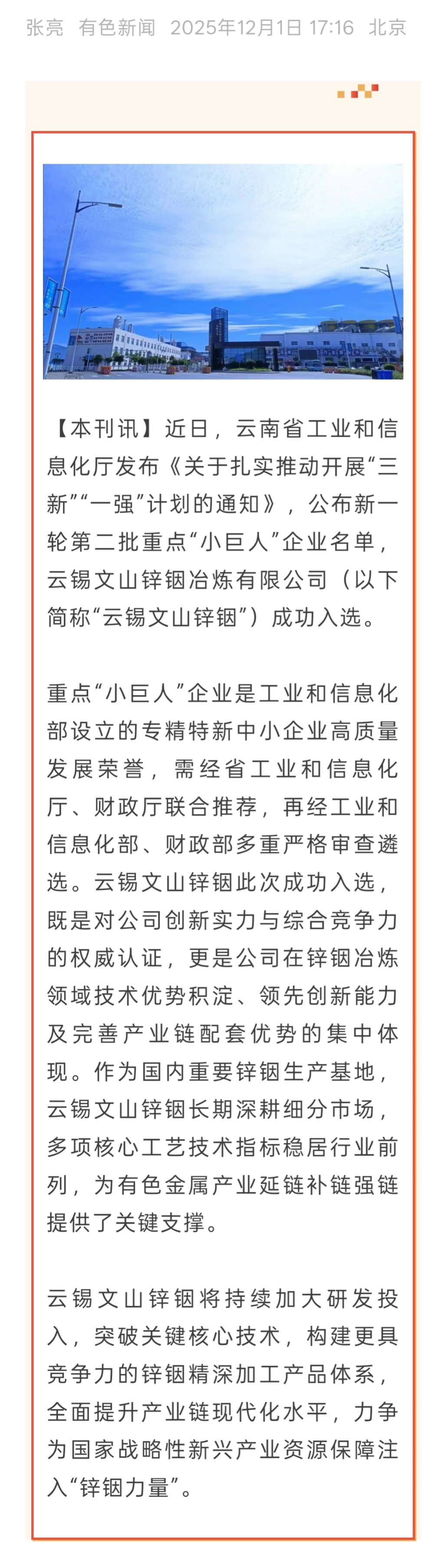 有色新聞:云錫文山鋅銦成功入選工業(yè)和信息化部重點“小巨人”企業(yè)