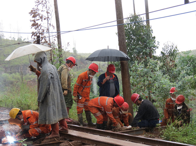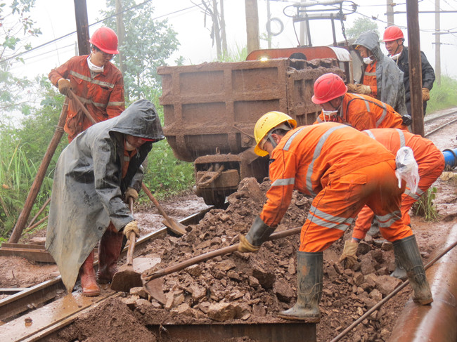 老廠分公司紅塘子鐵道運(yùn)輸線路是馬鹿塘坑出礦的主要運(yùn)輸線路,承擔(dān)著80%的礦量運(yùn)輸任務(wù)。8月3日,由于連續(xù)多日強(qiáng)降雨,老廠分公司紅塘子鐵道運(yùn)輸線路段出現(xiàn)局部陷落問題,運(yùn)輸線路生產(chǎn)受阻。對此,敢打硬仗的馬坑干部職工在洪災(zāi)面前不氣餒,困難面前不低頭,以泰山壓頂不彎腰的氣魄與暴雨奮力搏斗,經(jīng)受住了一場特殊的考驗(yàn),譜寫了一曲“狂風(fēng)暴雪何所懼,奮力抗災(zāi)保生產(chǎn)”的樂章。