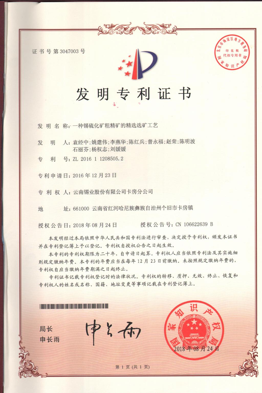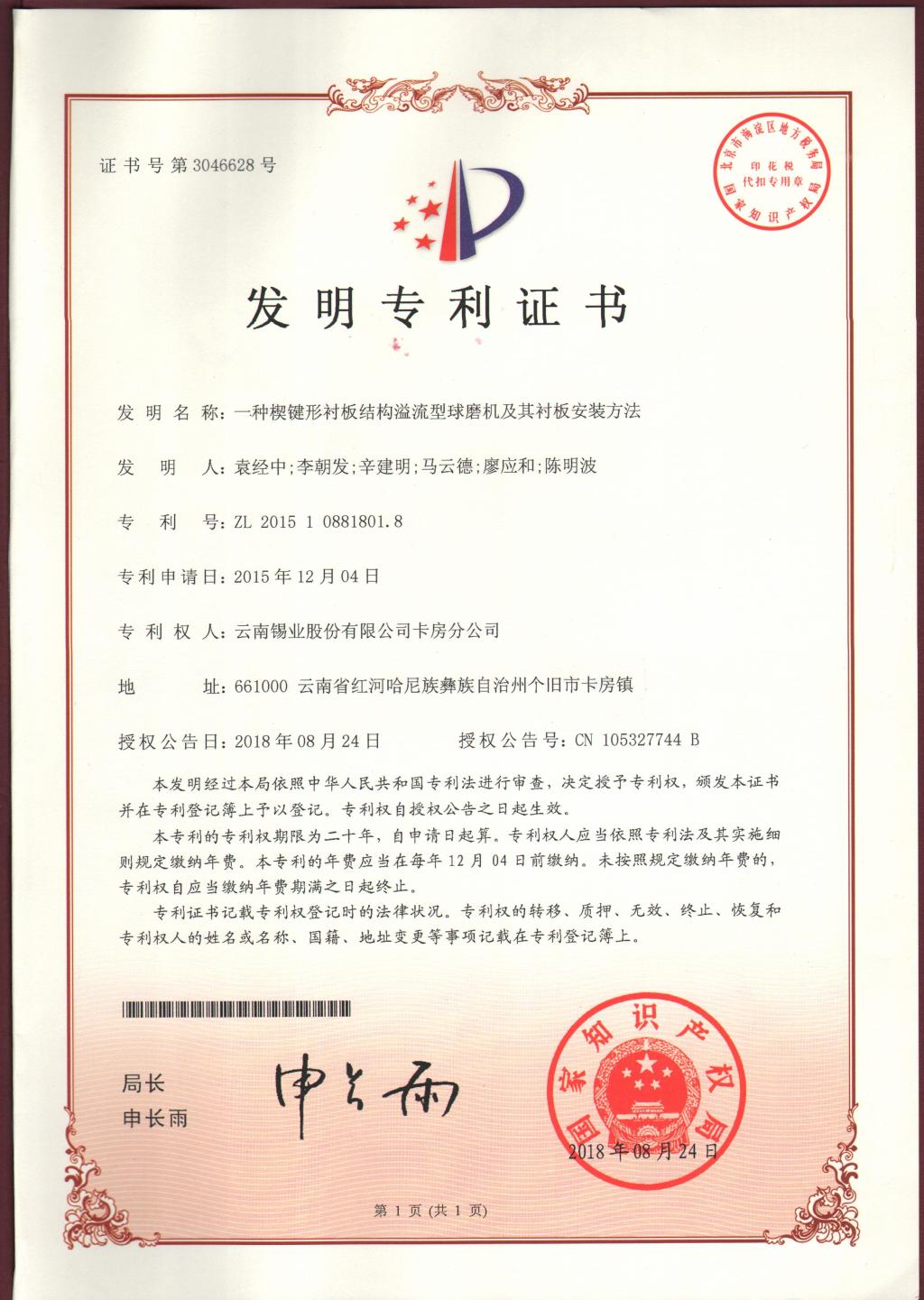 近日,卡房分公司申報(bào)的發(fā)明專利《一種楔鍵形襯板結(jié)構(gòu)溢流型球磨機(jī)及其襯板安裝方法》《一種錫硫化礦粗精礦的精選選礦工藝》再獲國家知識產(chǎn)權(quán)局正式授權(quán),并授予國家發(fā)明專利證書。這是今年繼8月份該分公司申報(bào)的發(fā)明專利《一種共生硫化礦中富含高砷硫精礦的降砷選礦工藝》《一種皂類捕收劑GY-10藥劑溶液的溶解配制方法》獲國家發(fā)明專利證書之后,再獲兩項(xiàng)發(fā)明專利授權(quán)。
