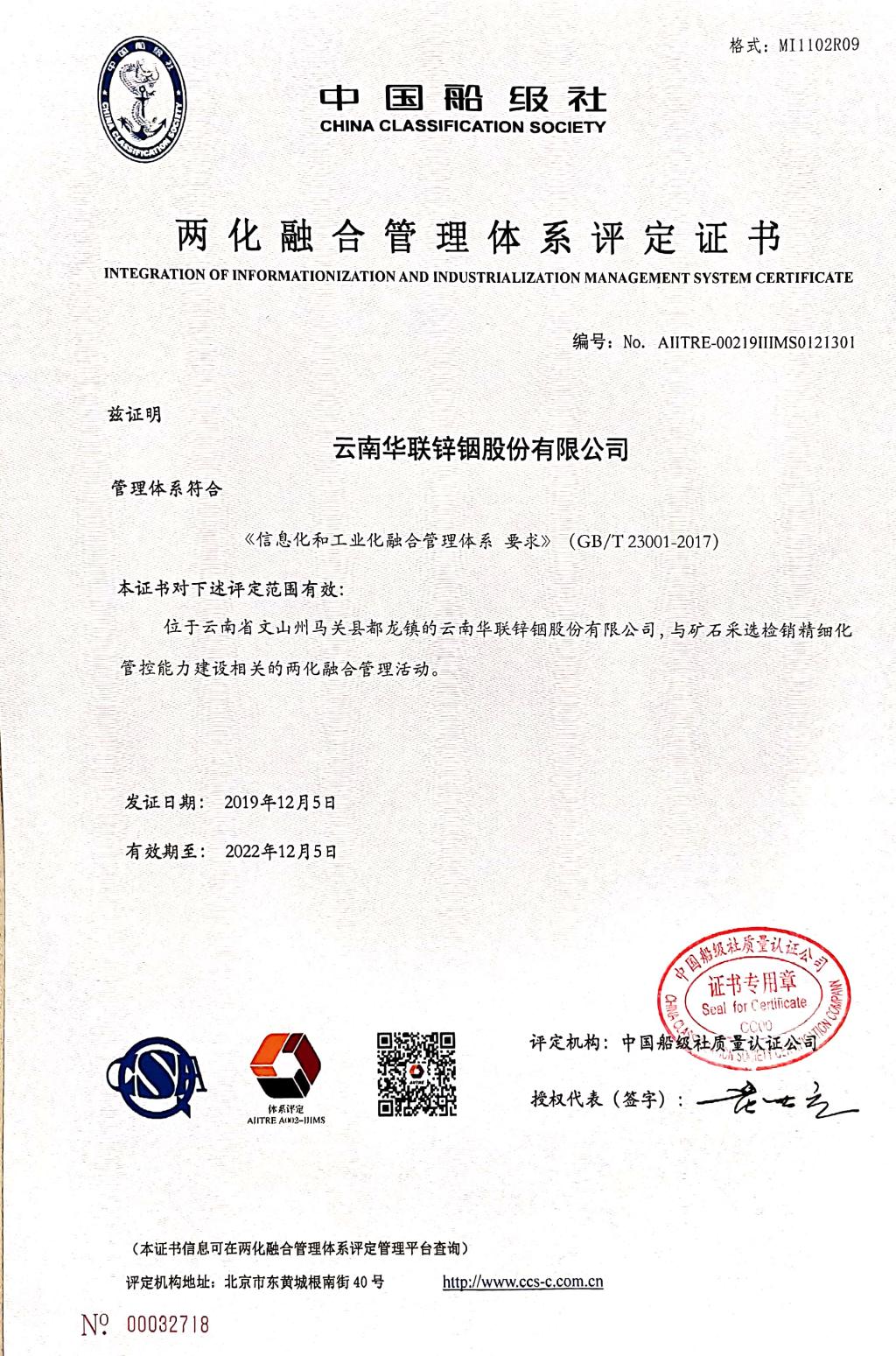 12月5日,華聯(lián)鋅銦公司通過交通部直管事業(yè)單位中國船級社兩化融合管理體系認證,并頒發(fā)“兩化融合管理體系認證證書”,成為文山州第一家通過該項體系認證的成員企業(yè)。