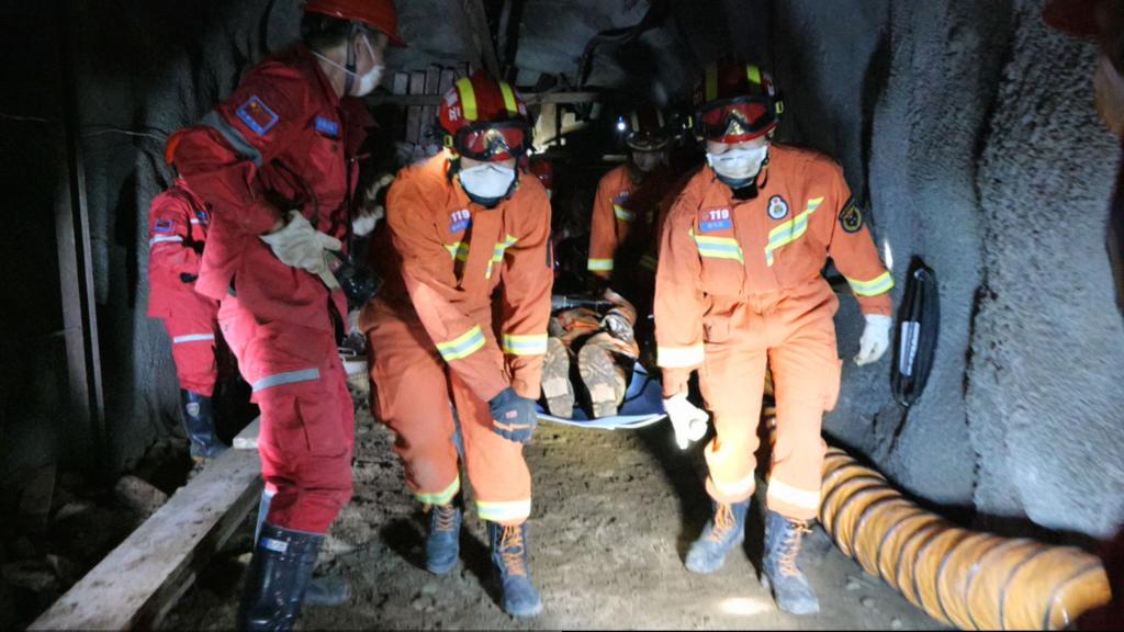 在制定科學(xué)救援方案后,救援隊(duì)員佩用正壓式氧氣呼吸器,攜帶雷達(dá)生命探測(cè)儀、熱成像儀、氣體檢測(cè)儀、對(duì)講機(jī)和個(gè)人防護(hù)裝備等進(jìn)入巷道冒頂區(qū)域進(jìn)行現(xiàn)場(chǎng)安全確認(rèn)和被困人員搜尋,經(jīng)雷達(dá)生命探測(cè)儀搜尋顯示3名被困人員有生命體征,但現(xiàn)場(chǎng)一氧化碳濃度78ppm超標(biāo),需對(duì)救援現(xiàn)場(chǎng)進(jìn)行機(jī)械通風(fēng),巷道冒頂嚴(yán)重,需進(jìn)行支護(hù)。在把現(xiàn)場(chǎng)搜尋情況及時(shí)層層匯報(bào)后,救援隊(duì)員攜帶風(fēng)機(jī)、風(fēng)帶、支護(hù)材料和破拆工具等設(shè)備分兩個(gè)組先后進(jìn)入事故現(xiàn)場(chǎng),照明、通風(fēng)、巷道支護(hù)作業(yè)隨即鋪開。準(zhǔn)備工作就緒后,現(xiàn)場(chǎng)救援人員采用《礦山(隧道)事故救援聯(lián)絡(luò)信號(hào)》聯(lián)絡(luò)被困人員,救援隊(duì)員用細(xì)木棍將系有食品、水的導(dǎo)繩從管道送給受困人員,并安撫受困人員情緒。不料,在快速的支護(hù)推進(jìn)中,突然地壓活動(dòng)頻繁,頂板再次冒落,救援隊(duì)在同受困人員保持聯(lián)系的同時(shí),只得暫時(shí)退至安全區(qū)域待命。4名專家技術(shù)人員再次進(jìn)入事故現(xiàn)場(chǎng)勘察和評(píng)估,經(jīng)專家技術(shù)組確認(rèn)現(xiàn)場(chǎng)地壓穩(wěn)定,可以向前支護(hù),搶險(xiǎn)救援組再次進(jìn)入現(xiàn)場(chǎng)進(jìn)行向前支護(hù)、清理巷道。鄒文鴻等領(lǐng)導(dǎo)在現(xiàn)場(chǎng)指揮著救援工作,要求救援人員要時(shí)刻留意事故現(xiàn)場(chǎng)環(huán)境,保證自身安全才能解救他人。經(jīng)救援人員的共同努力,生命通道成功打通,被救出的3名受困人員均無(wú)大礙,已在醫(yī)務(wù)人員的護(hù)送下離開事故現(xiàn)場(chǎng),去往就近醫(yī)院接受系統(tǒng)的檢查和治療。經(jīng)救援隊(duì)現(xiàn)場(chǎng)搜尋確認(rèn)已無(wú)受困人員,鄒文鴻下令各工作組撤離事故現(xiàn)場(chǎng)。