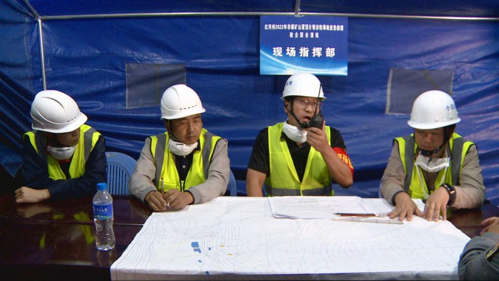 此次演練方式采取實(shí)地演練,即在實(shí)際環(huán)境下組織專項(xiàng)實(shí)兵演練,并采取單頻觀摩的方式進(jìn)行觀摩?!熬掳l(fā)生冒頂了,井下發(fā)生冒頂了,大家快撤,大家快撤……”井下值班長(zhǎng)大聲叫到。演練模擬大屯錫礦1360坑450米探礦平巷掘進(jìn)迎頭外50米左右突然發(fā)生巷道頂板冒頂坍塌,并將巷道內(nèi)的風(fēng)管、水管、電話線、供電線路砸斷,巷道被垮落的支護(hù)、巖石堵塞,長(zhǎng)度約10米左右,通過(guò)查看出入井記錄和人員定位系統(tǒng),核實(shí)單班入井人員共26人,安全出井23人,3名人員被困。大屯錫礦逐級(jí)上報(bào),州政府應(yīng)急辦接報(bào)后遂啟動(dòng)《紅河州非煤礦山生產(chǎn)安全事故應(yīng)急預(yù)案》,同時(shí)責(zé)成各相關(guān)部門、單位和救援隊(duì)趕赴事故現(xiàn)場(chǎng)展開救援。包括現(xiàn)場(chǎng)指揮、搶險(xiǎn)救援、醫(yī)療衛(wèi)生、物資保障在內(nèi)的9個(gè)工作組經(jīng)短暫集結(jié)了解險(xiǎn)情后,分別領(lǐng)命向事故地點(diǎn)進(jìn)發(fā)。與此同時(shí),現(xiàn)場(chǎng)指揮部指揮長(zhǎng)、個(gè)舊市副市長(zhǎng)鄒文鴻等領(lǐng)導(dǎo),前往現(xiàn)場(chǎng)指揮部指揮救援工作的開展。