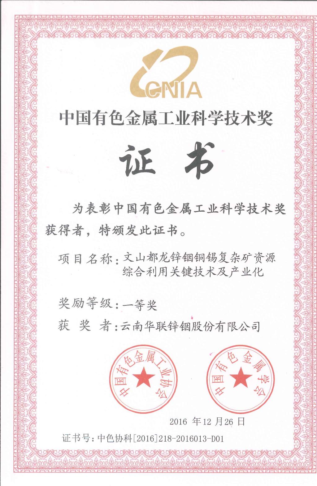 2011年以來(lái)累計(jì)投入科研資金3.4億元,實(shí)現(xiàn)科技創(chuàng)效4.74億元,取得了顯著的科技成果,其中,“銦鋅錫銅復(fù)雜多金屬礦資源高效綠色利用關(guān)鍵技術(shù)及產(chǎn)業(yè)化示范項(xiàng)目”榮獲2017年度中國(guó)循環(huán)經(jīng)濟(jì)協(xié)會(huì)科學(xué)技術(shù)一等獎(jiǎng);“銦鋅錫銅共伴生多金屬礦資源高效利用關(guān)鍵技術(shù)及產(chǎn)業(yè)化項(xiàng)目”榮獲云南省科技進(jìn)步一等獎(jiǎng);“文山都龍鋅銦銅錫復(fù)雜礦資源綜合利用關(guān)鍵技術(shù)及產(chǎn)業(yè)化項(xiàng)目”榮獲中國(guó)有色金屬工業(yè)科學(xué)獎(jiǎng)一等獎(jiǎng)。