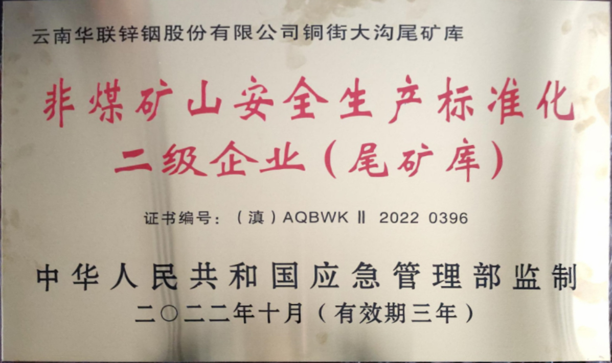近日,華聯(lián)鋅銦公司銅街大溝尾礦庫(kù)、新田尾礦庫(kù)順利獲得“非煤礦山安全生產(chǎn)標(biāo)準(zhǔn)化二級(jí)企業(yè)”認(rèn)定,并收到由中華人民共和國(guó)應(yīng)急管理局監(jiān)制、云南省應(yīng)急管理廳頒發(fā)的牌匾和證書。為進(jìn)一步落實(shí)企業(yè)安全生產(chǎn)主體責(zé)任,華聯(lián)鋅銦公司緊緊圍繞“五個(gè)為零、兩個(gè)確保、一個(gè)不超”的安全生產(chǎn)目標(biāo),嚴(yán)格貫徹落實(shí)《安全生產(chǎn)法》,切實(shí)履行“黨政同責(zé)、一崗雙責(zé)、齊抓共管、失職追責(zé)”的安全生產(chǎn)責(zé)任,通過(guò)全員全過(guò)程參與,使公司安全生產(chǎn)標(biāo)...